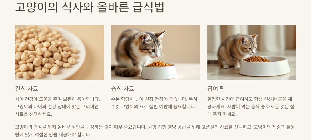 A. 고양이는 육식 동물이므로, 단백질 함량이 높은 고품질의 사료를 선택해야 합니다. 또한, 수분 보충을 위해 습식 사료도 함께 급여하는 것이 좋습니다.
