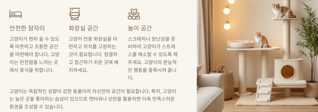- 화장실 공간: 고양이 전용 화장실을 마련하고 위치를 고정하는 것이 중요합니다.